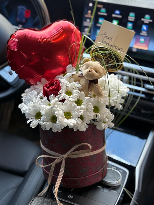 Bordo Kutuda Papatya Tek Gül Ayıcık ve Kalp Balon Hediye