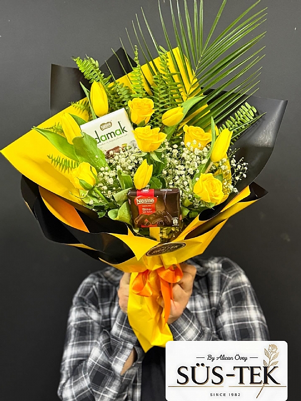 5 Sarı Lale 5 Sarı Gül Damak ve Nesle Çikolata Buketi